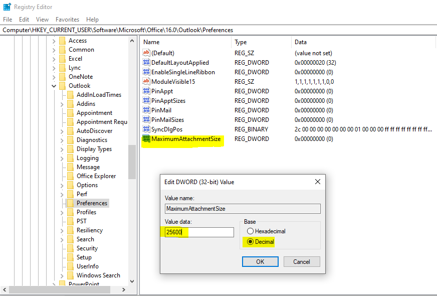 Note: If you don`t see MaximumAttachmentSize, add a registry key and value. Go to Edit, select New > DWORD Value, enter MaximumAttachmentSize, and press Enter.