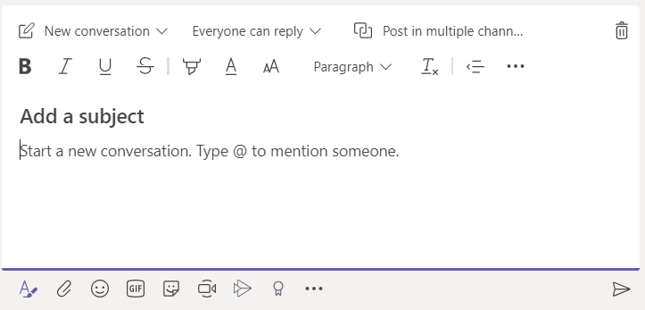 Microsoft Teams lets you add a title, mark the message as important, and add other rich text options such as bullet points, highlighting etc.