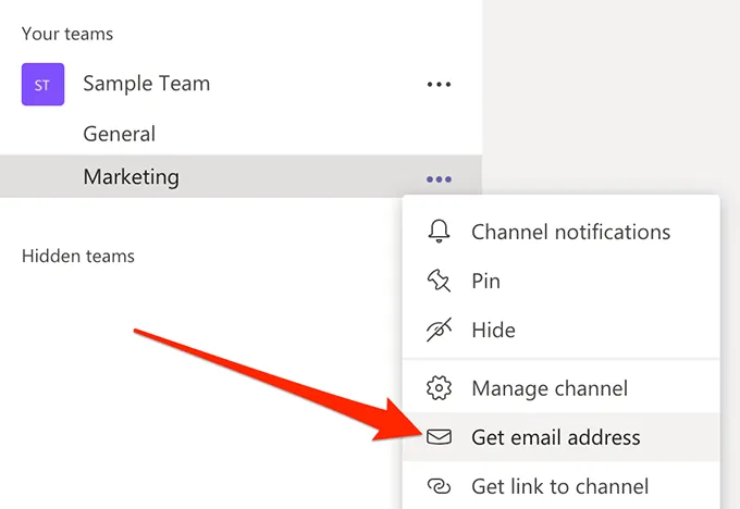 Find the channel where you want to post, click on the three-dots next to it, and choose Get email address.