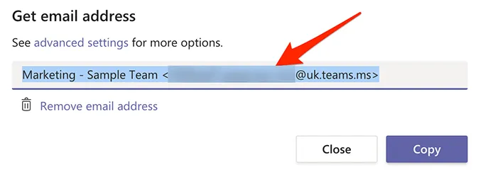 Any emails you send to the email address shown on your screen will be posted in the chosen channel in Teams.