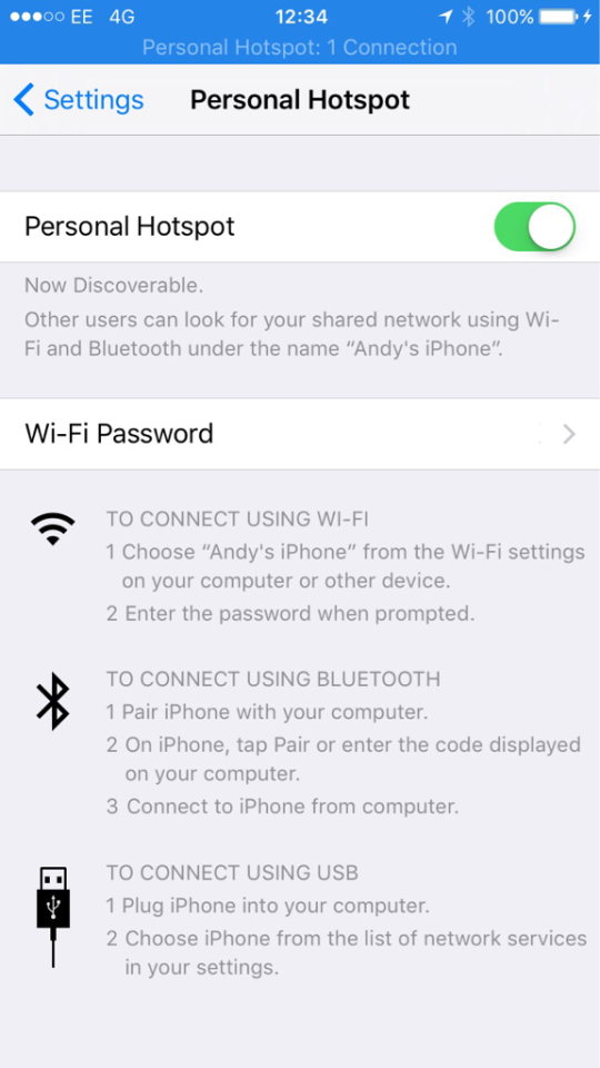 Step 3: Turn on Personal Hotspot option. You should now see the default password for the hotspot.