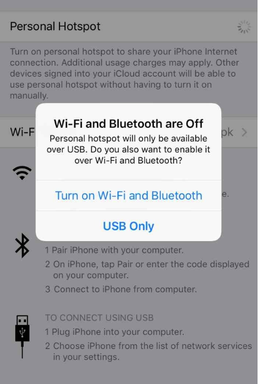4. If Wi-Fi and Bluetooth are turned off on your iPhone, you will get the following notification. Tap Turn on Wi-Fi and Bluetooth option to turn on them and turn on Personal Hotspot.
