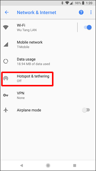 1. Open your phone’s Settings screen, tap the More option under Wireless & Networks, and tap Tethering & portable hotspot