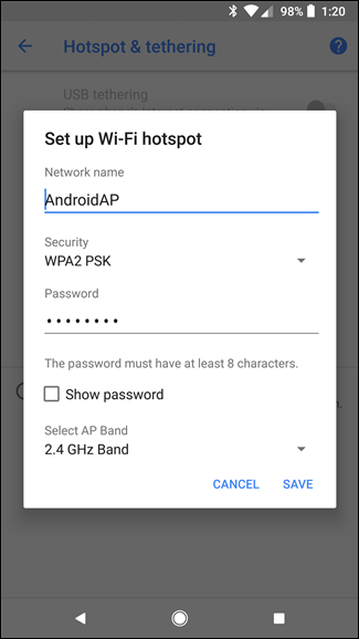 2. Tap the Set up Wi-Fi hotspot option and you’ll be able to configure your phone’s Wi-Fi hotspot, changing its SSID (name) and password.
