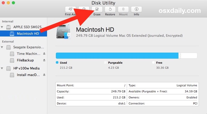 3. Choose “Macintosh HD” , then select the “Erase” button