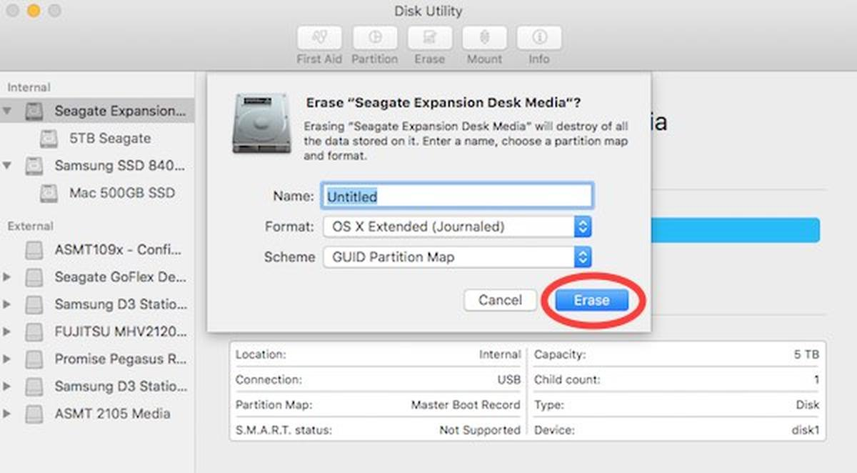 4. Choose a name for the erased drive, like ‘Macintosh HD’ and then next to “Format” pull down the drop down menu to select “OS X Extended (Journaled)”, then click on “Erase” when you are ready to completely wipe the Mac