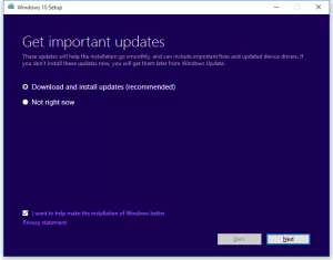 Windows 10 Setup will start with the “Get important updates” dialog. We recommend selecting “Download and install updates” on this page: