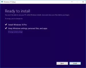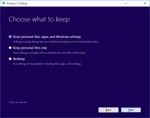 The last and most important page in the Windows 10 repair installation process is the page that says “Choose what to keep.” On this page, you must select the first radio button, as shown in the image below. Make sure to select “Keep personal files, apps, and Windows settings” selected and then press “Next” to begin the repair install:
