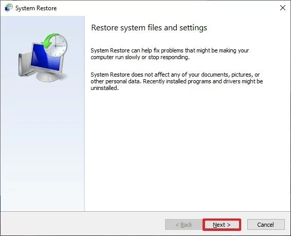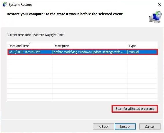 6. Click the Scan for affected programs button to understand the apps that will no longer be available because they`re added after the creation of the restore point.