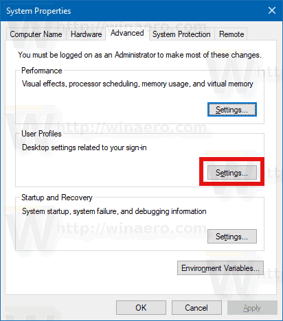 4. Advanced System Properties will open. There, click on the Settings button in the User Profiles section.
