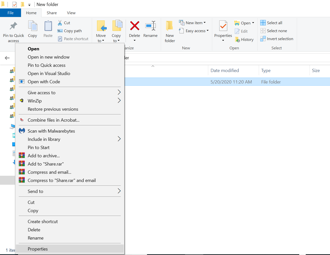 2. Right-click the item, and select the Properties option