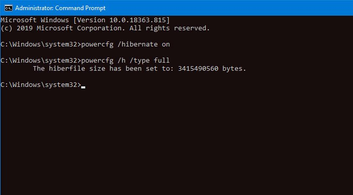 4. Set the Hiberfile type as Full using this command: powercfg /h /type full