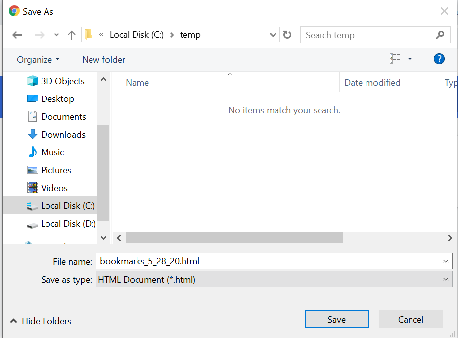3. Put your exported bookmarks in Temp folder and then click “Save.”
