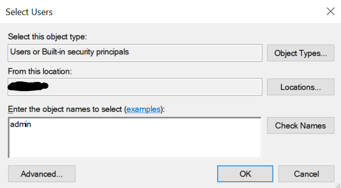 8. Enter your new account name e.g admin and click check name > Click OK (Make sure From this Location is your PC name)