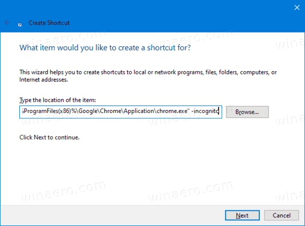 2. In the shortcut target box, type the path to the Chrome.exe file followed by the -icognito argument.