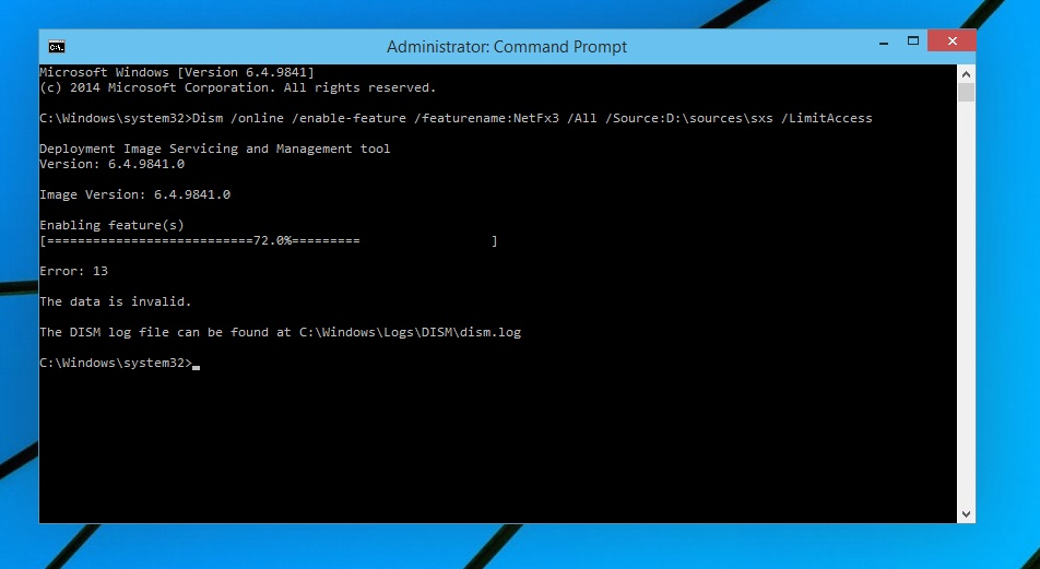 Dism /online /enable-feature /featurename:NetFX3 /All /Source:D:sourcessxs /LimitAccess