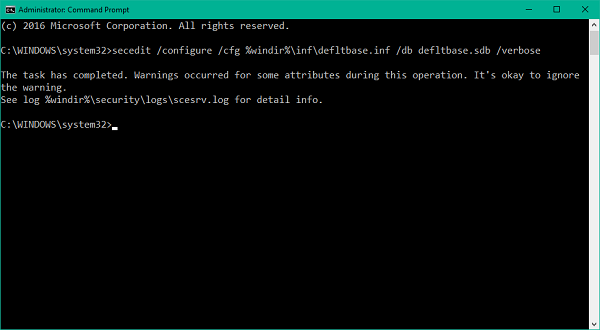 secedit /configure /cfg %windir%infdefltbase.inf /db defltbase.sdb /verbose