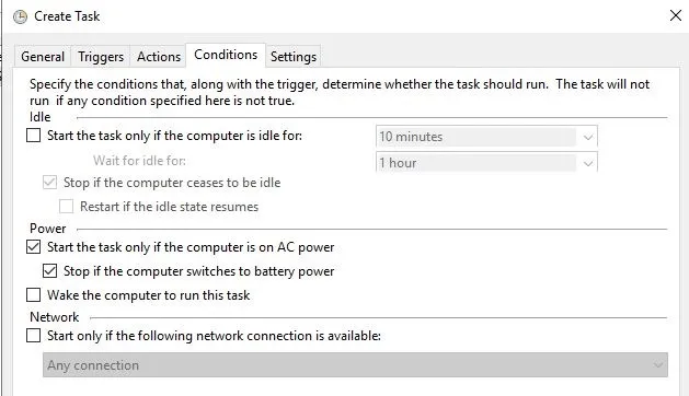 13. On the Condition tab, clear both boxes for AC and battery power under the power section. You need to uncheck the “Stop if computer switches to battery power” option first to clear both of them.