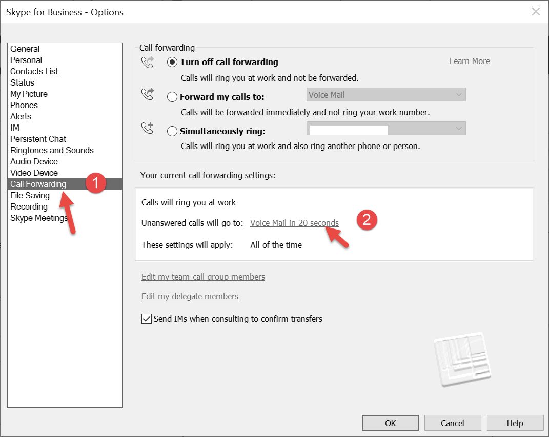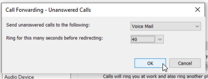 2. Click Call Forwarding and find "Unanswered calls will go to" and set the value to the number of seconds you want: