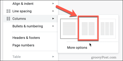 3. In the Format menu, hover over Columns, then click the two columns icon in the middle