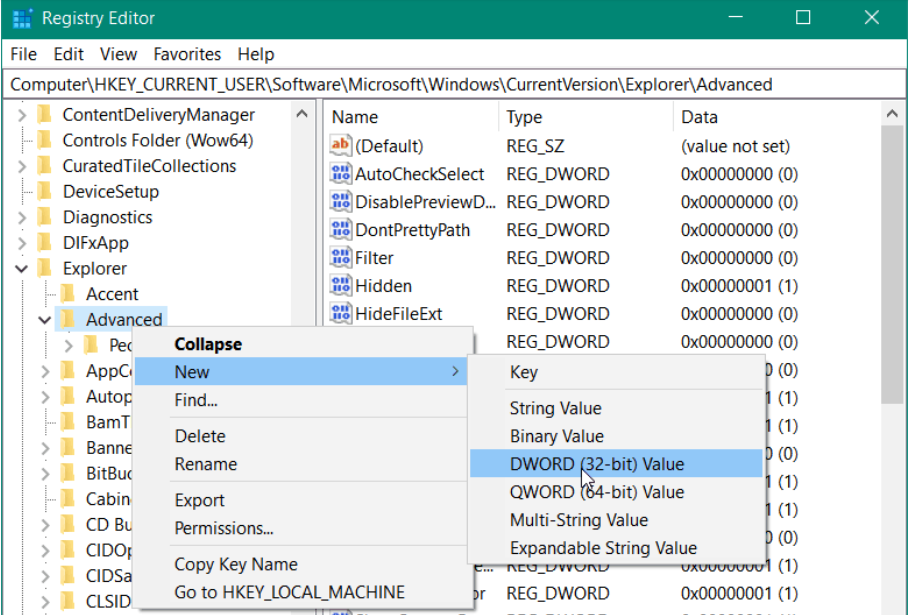HKEY_CURRENT_USERSoftwareMicrosoftWindowsCurrentVersionExplorerAdvanced