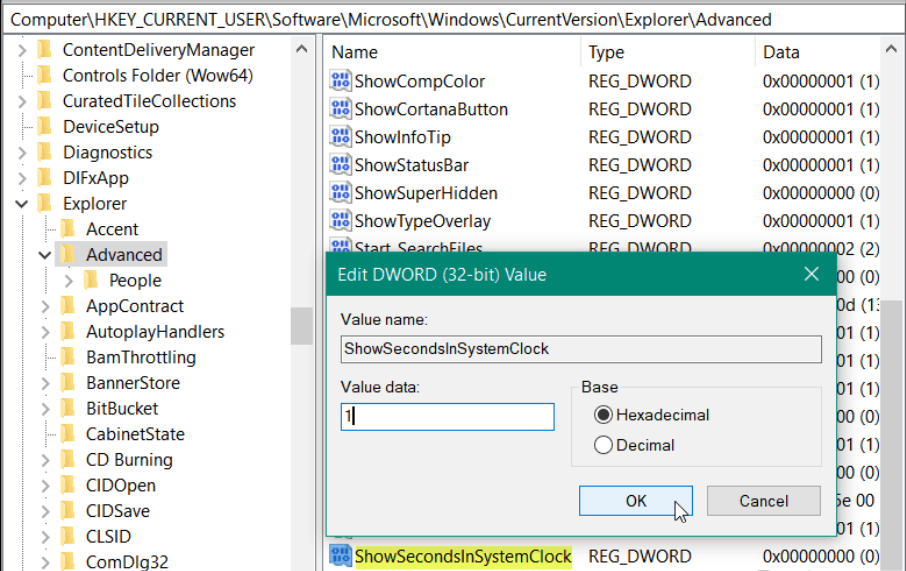 5. Name the new value: ShowSecondsInSystemClock and hit Enter