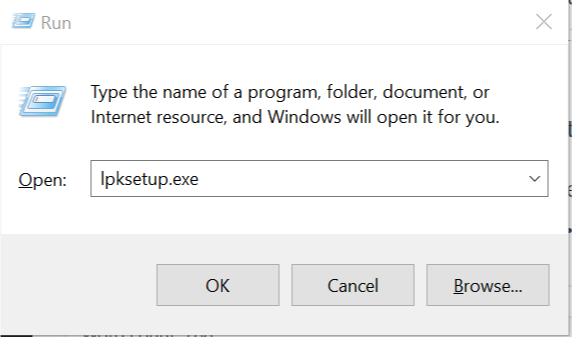 2. Type, lpksetup.exe and hit enter.