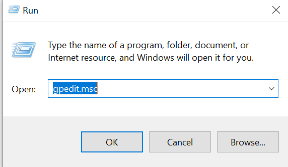 2. Type `gpedit.msc` in the Run command and click OK