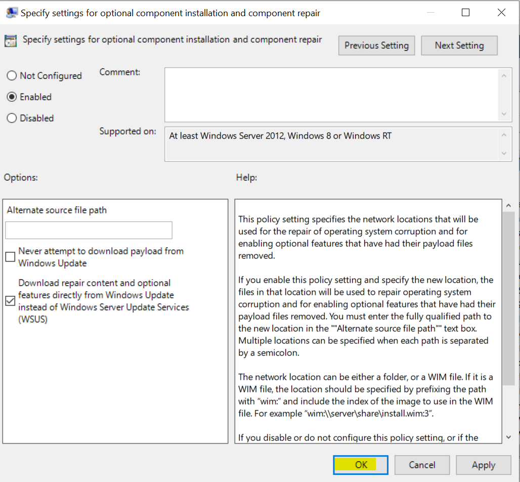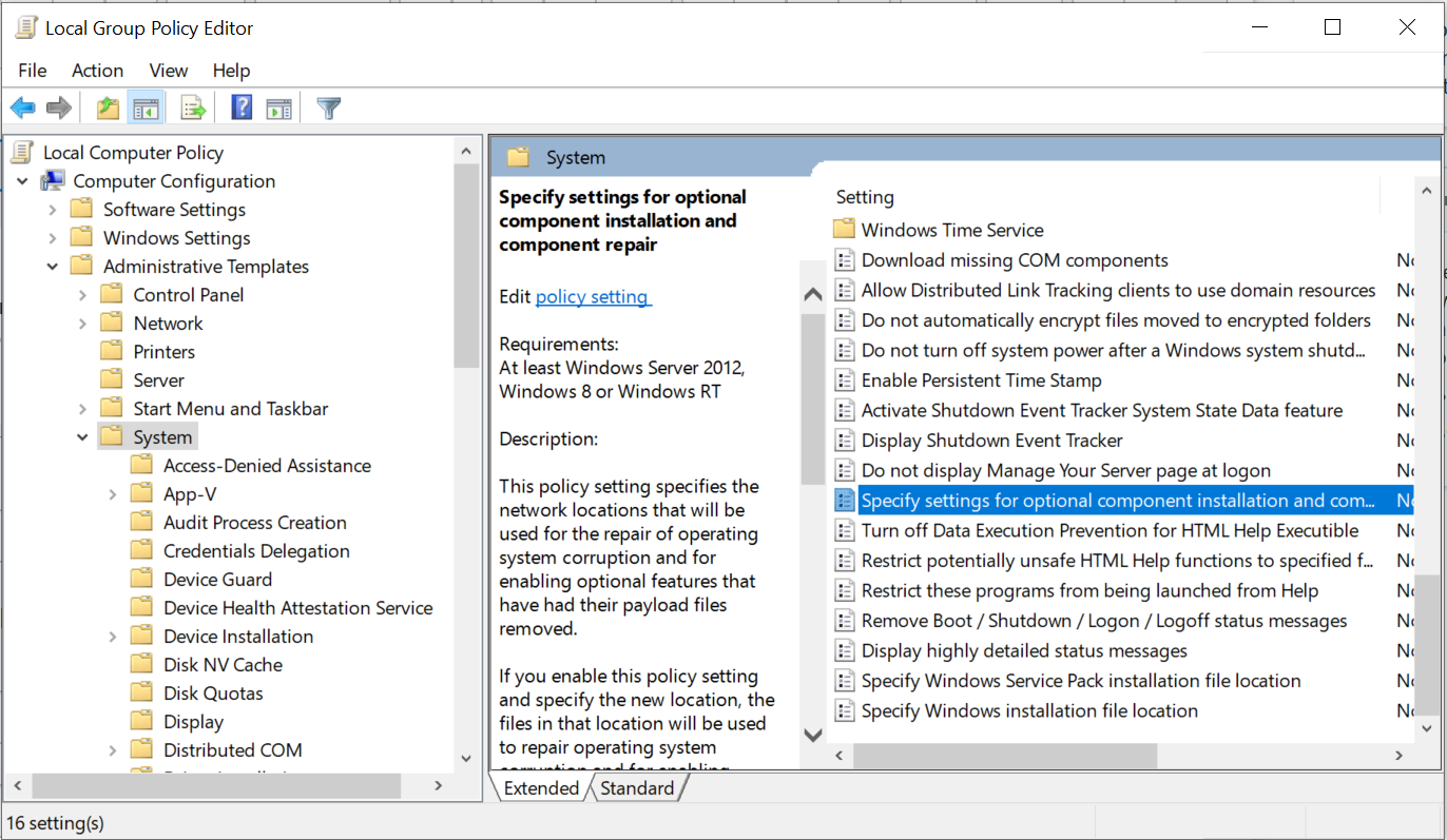 3. Navigate to Computer Configuration > Administrative Templates >System > Specify settings for optional component installation and component repair