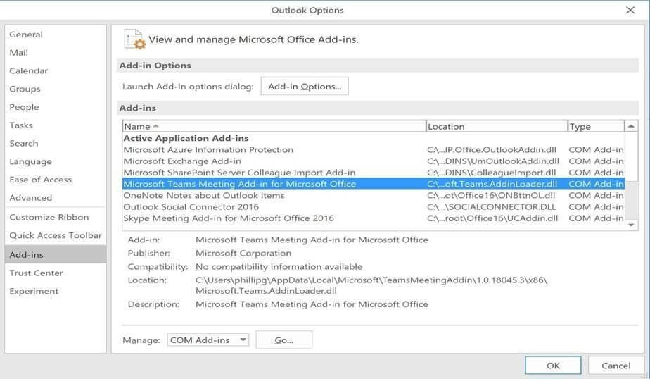 4. Make sure the Microsoft Teams Meeting Add-in for Microsoft Office is listed in the Active Application Add-ins list.