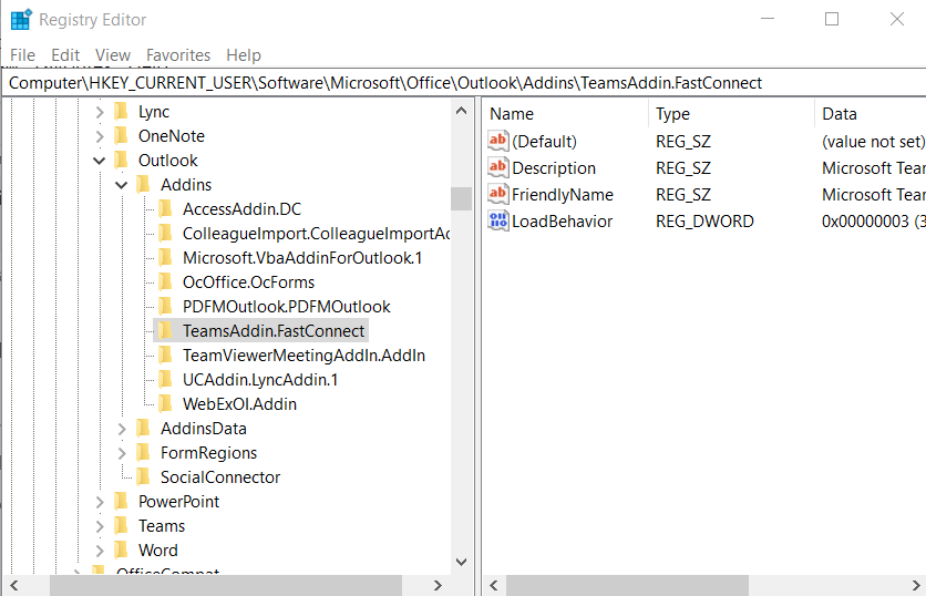 2. Navigate to HKEY_CURRENT_USER/Software/Microsoft/Office/Outlook/Addins