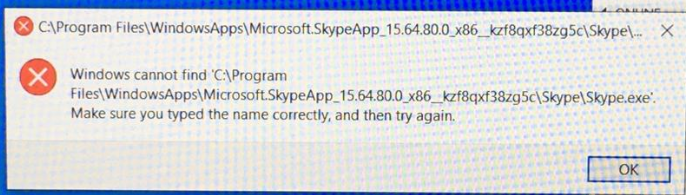 Windows cannot find C:\Program Files\WindowsApps\Microsoft.SkypeApp_15.64.80.0_x86_kzf8qxf38zg5c\Skype.exe. Make sure you typed the name correctly, and then try again