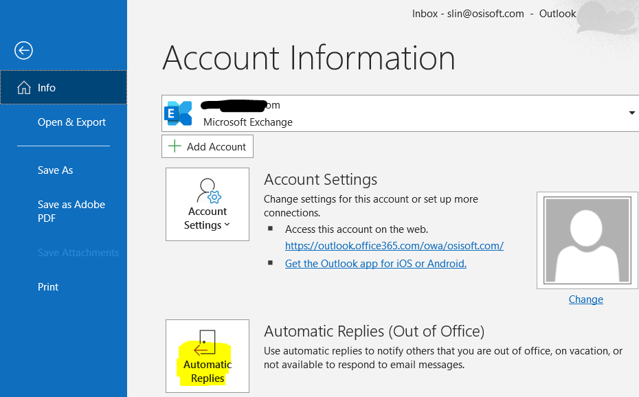 1. Open outlook, go to File > Info > click on Automatic replies (Out of Office)
