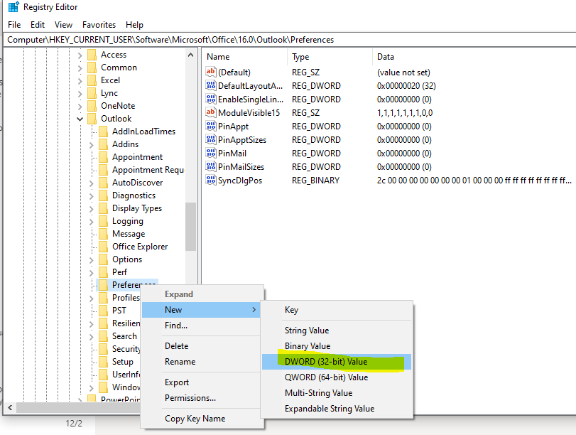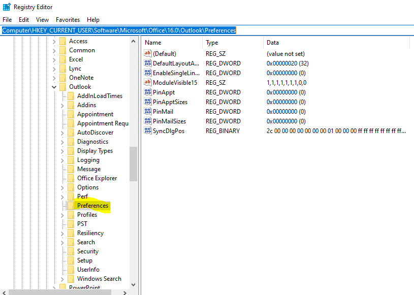 Outlook 2019 and 2016: Computer/HKEY_CURRENT_USER/Software/Microsoft/Office/16.0/Outlook/Preferences