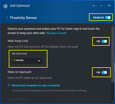 3. Under Walk Away Lock, either: Click On to Off. Modify Set lock timer.