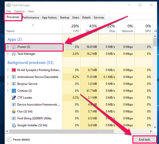 2. Open Task Manager, and stop the iTunes Process (If it is running)