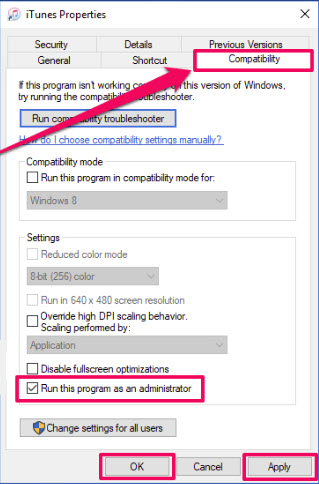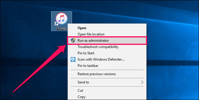Or Right click on iTunes Icon > choose Properties > Go to Compatibility > Checked the box Run this program as an administrator > Click Apply and then OK Button.