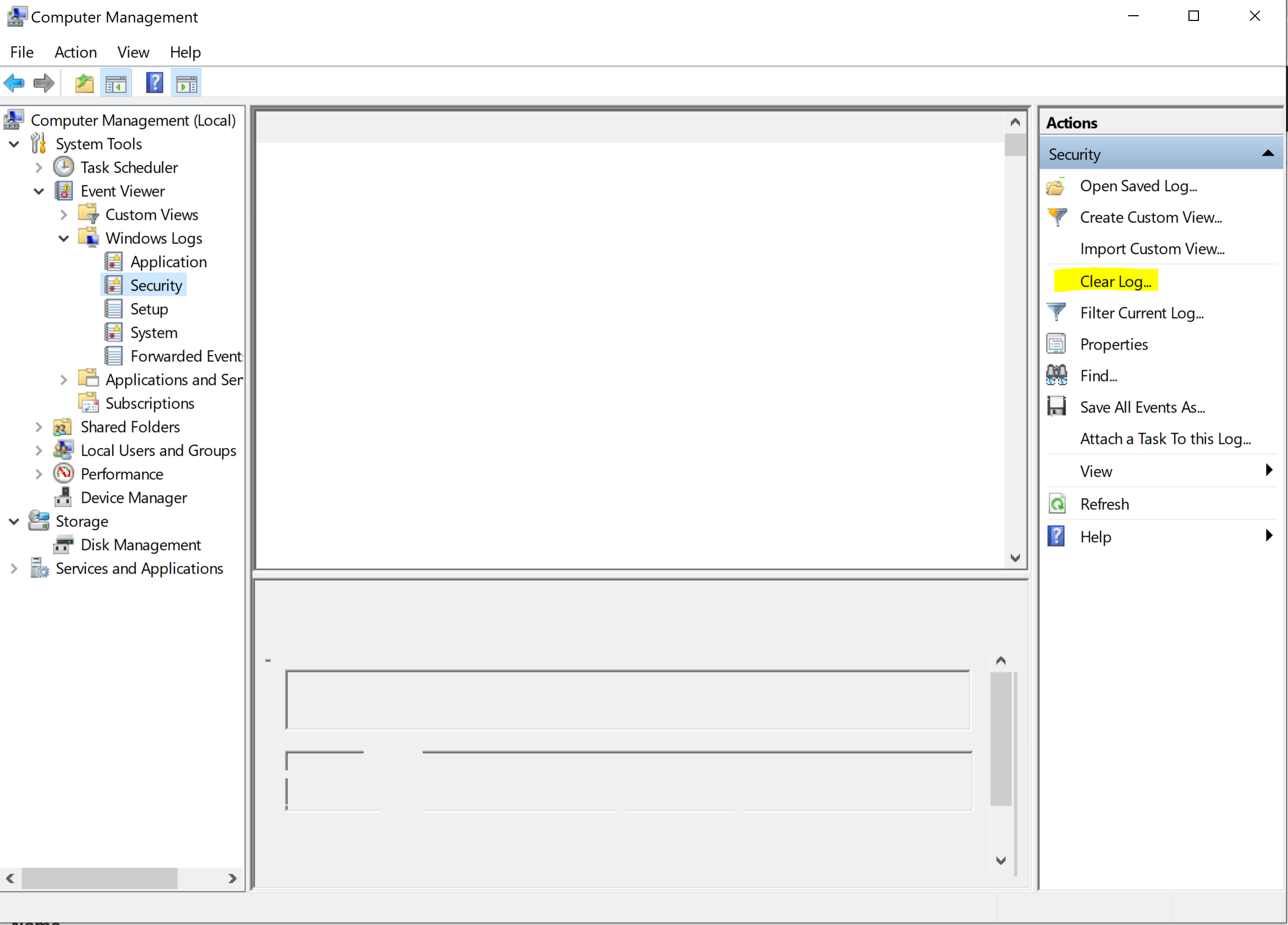 Open Administrative Tools > Event Viewer Browse to Windows Logs > Security Select "Clear Log…"