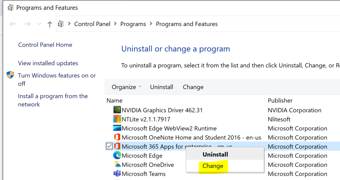 3. In Programs and features, select the Office version you have installed, and click Change.