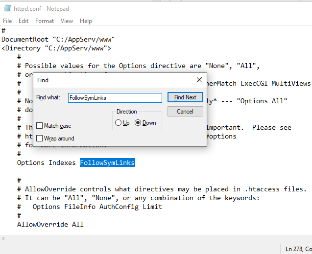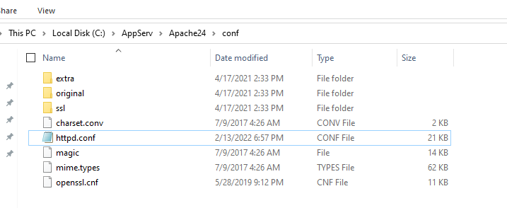1. Open the httpd.conf file located in the C -> AppServ -> Apache24 -> conf (Depend on your install location)