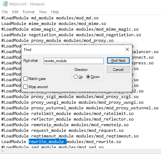 2. Next, find the #LoadModule rewrite_module and then remove the #