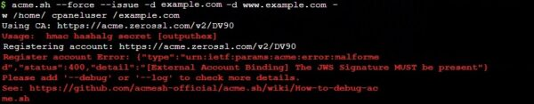 Error: Using CA: https://acme.zerossl.com/v2/DV90 Create account key ok. No EAB credentials found for ZeroSSL, let`s get one Usage: _hmac hashalg secret [outputhex] Registering account: https://acme.zerossl.com/v2/DV90 Register account Error: {"type":"urn:ietf:params:acme:error:malformed","status":400,"detail":"[External Account Binding] The JWS Signature MUST be present"} Please add `--debug` or `--log` to check more details. See: github.com