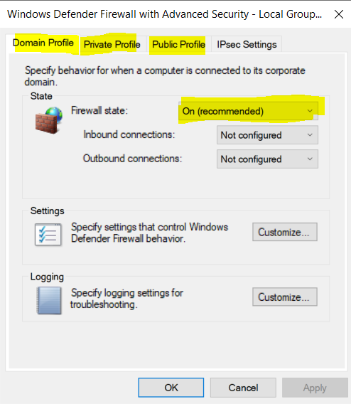 5. Under Domain profile, Private Profile and Public Profile tabs > set Firewall state to off