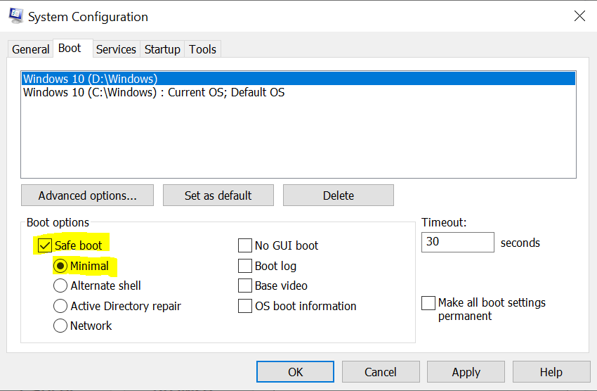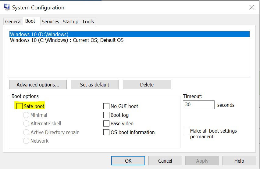 IMPORTANT: If you want to start Windows 10 in Normal Mode, ensure Safe boot is unchecked.