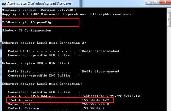 Type “ipconfig” and press enter and look for “IPv4 Address” under either Wireless Network Connection or Local Area Connection (depending on if your computer is using Wi-Fi or not).